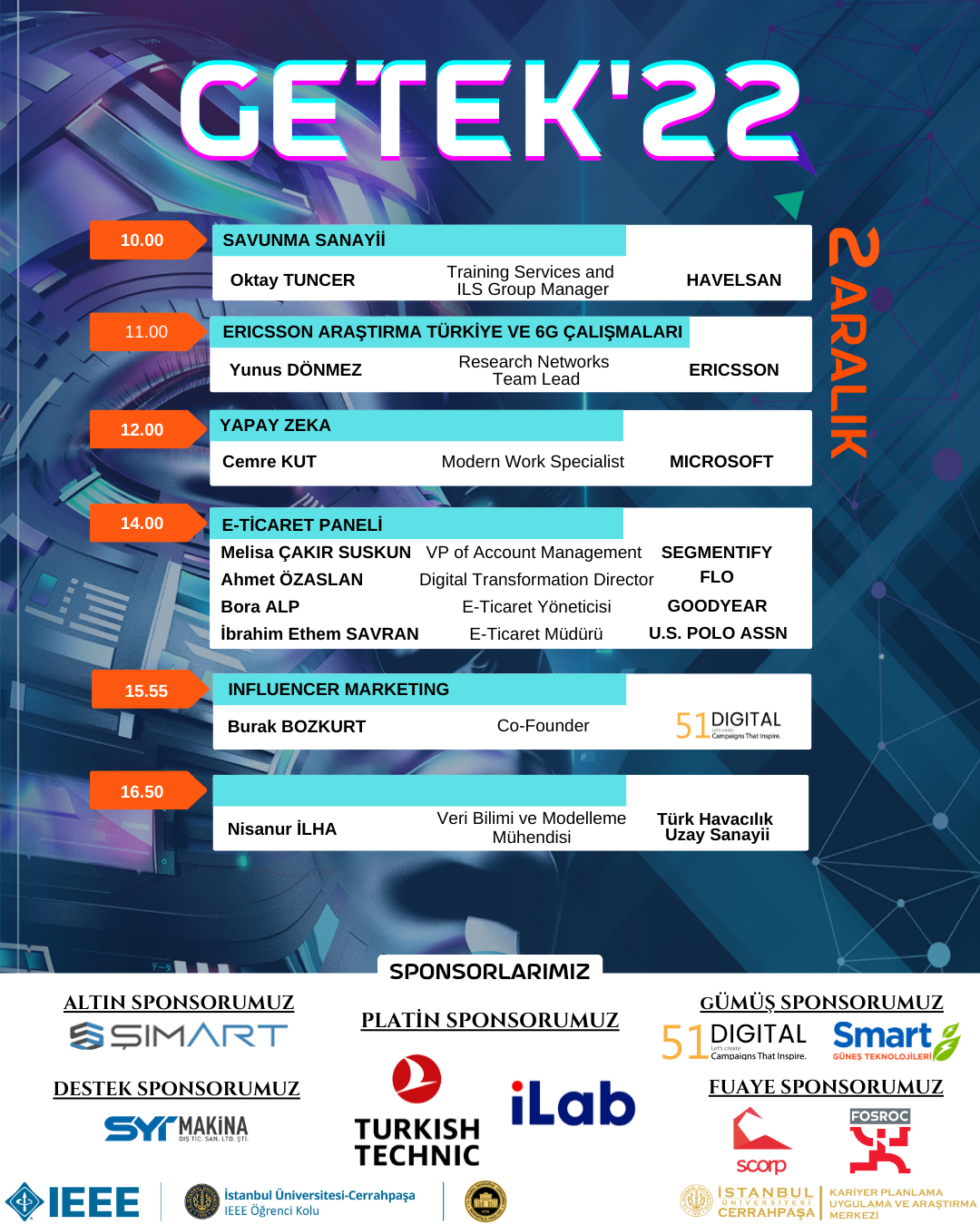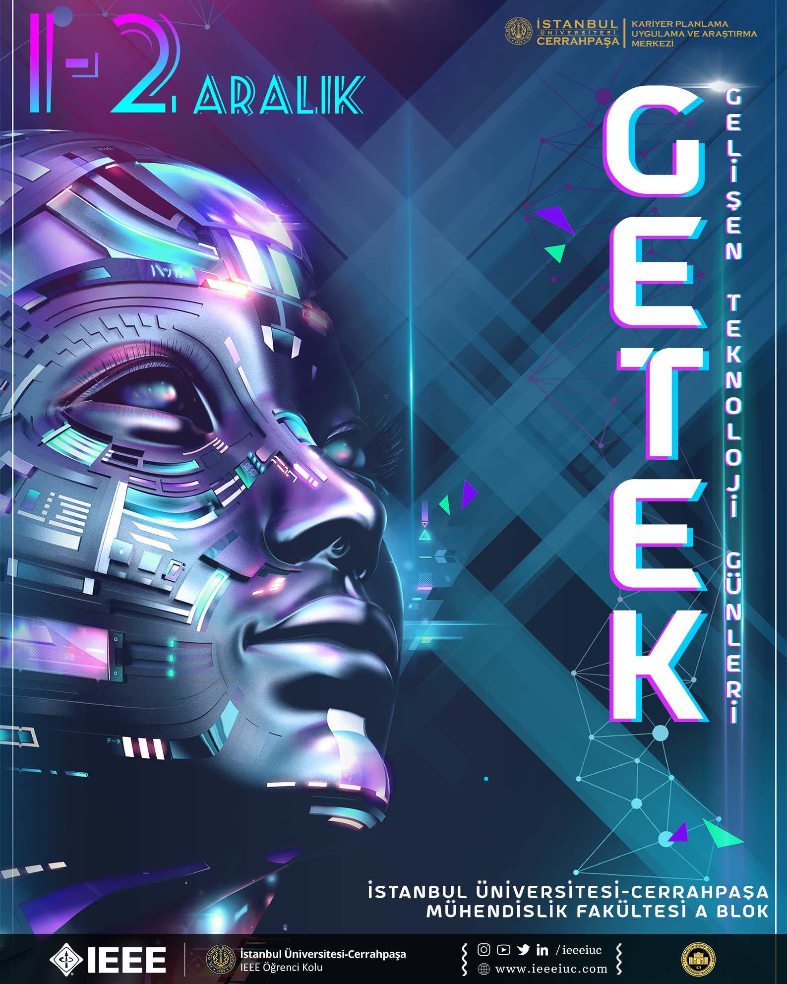 IEEE İstanbul Üniversitesi-Cerrahpaşa’nın düzenlediği okulumuz bünyesindeki en büyük ve gelenekselleşmiş etkinliklerden biri olan Gelişen Teknoloji Günlerinin (GETEK) bu yıl 15.’sini 2 günlük tecrübe serüveniyle, 1-2 Aralık tarihlerinde gerçekleştireceğiz. Etkinliğimizde sizleri Microsoft, Google, Ubisoft, Turkish Technic, Hepsiburada, Havelsan, Türk Havacılık Uzay Sanayii, 51 Digital, CD Media, Kariyer.net, Goodyear FLO, U.S. Polo, Şımart gibi sektörün öncü firmalarından gelen alanında yetkin konuşmacılarla buluşturacağız. Böylece sizler, onların tecrübelerinden faydalanıp gelişen teknoloji ile mezun olduktan sonra sektörde bizleri nelerin beklediğini öğrenmiş olacaksınız. Etkinliğimizde oturumlarımızda edineceğiniz tecrübeler gibi fuaye alanında bulunacak olan ilgi çekici standlar, ikramlar ve sürpriz çekilişler ile birlikte unutulmayacak iki güne hazırlanın. Teknolojiden haberdar olmamızı sağlayan GETEK etkinliklerimizden haberdar olmak için bizi takipte kalın! Gelecek GETEK’te ya sen?
