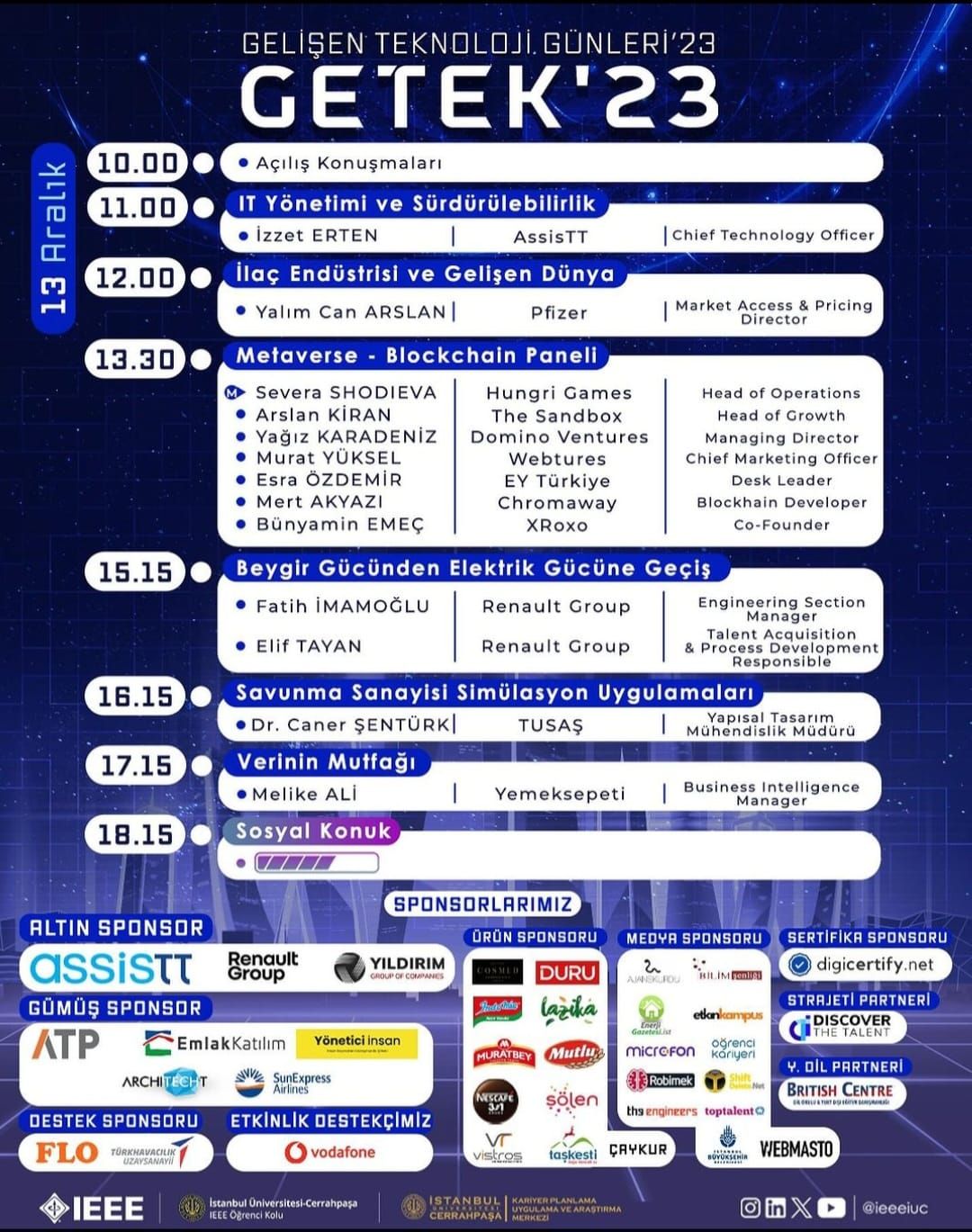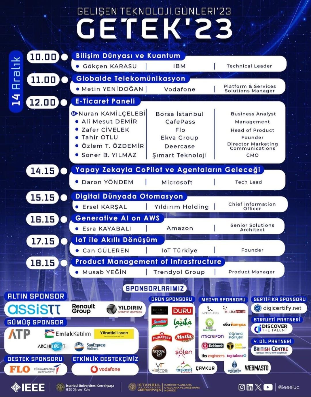 IEEE İstanbul Üniversitesi-Cerrahpaşa olarak Etkinlik Koordinatörlerimiz liderliğinde görev alan Gelişen Teknoloji Günleri Hazırlık Ekibimizle birlikte ortaya çıkan ve 13-14 Aralık tarihlerinde Mühendislik Fakültesi A Blok Konferans Salonunda düzenlenen marka etkinliğimiz GETEK'in 16.sı büyük bir coşkuyla tamamlandı. Sektörünün önde gelen firmalarından C level konuşmacıları ağırladığımız etkinliğimizde Microsoft, Amazon Web Sevices, IBM, Renault Group, Trendyol, Pfizer, Loreal, TUSAŞ, Vodafone, Assistt, The Sandbox, Yemeksepeti, Borsa İstanbul, Yıldırım Holding, Hungri Games, EY Türkiye, FLO, IoT Türkiye, Webtures, Deercase, Ekva Group ve sürpriz oturumuyla etkinliğimizde yer alan TÜBİTAK Başkanı Sayın Prof. Dr. Hasan Mandal’ı ağırlayarak değerli tecrübelerini dinleme ve kariyer fırsatlarına erişme imkanı bulduk. Ayrıca ATP, SunExpress, Yönetici İnsan, Emlak Katılım ve Architect firmaları etkinliğimize destek veren sponsorlarımız arasındaydı. Bu sayede katılımcılarımıza hem oturumlarda hem de fuaye alanında teknolojinin nabzını tutarak geleceğe bir yol haritası çizecek eşsiz deneyimler sunduk. Medya sponsorlarımız sayesinde etkinliğimizin marka değerini ve tanınırlığını artırırken etkinliğimizde bizlerle olan ürün sponsorlarımızla da katılımcılarımıza yiyecek ve içecek imkânı sunarak fuaye alanımızı zenginleştirdik. Etkinlik sonunda ise çeşitli çekilişlerle katılımcılarımızı ödüllendirdik ve sosyal konuk oturumumuzda rap dünyasının ünlü müzisyen ve söz yazarı Anıl Piyancı'yı ağırlayarak katılımcılarımıza keyifli bir deneyim sunduk ve 2 günlük etkinlik serüvenimizi sonlandırdık.